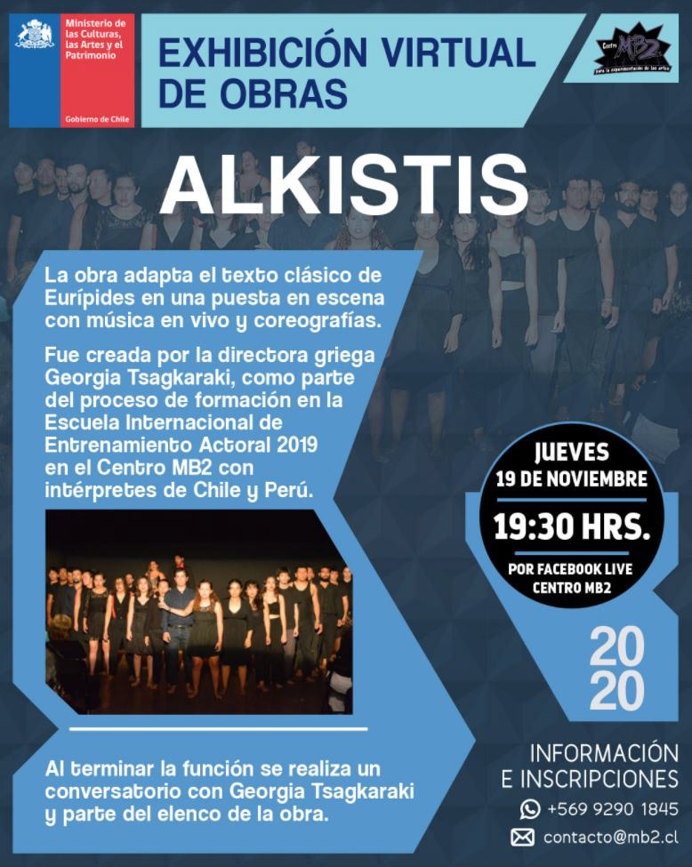 Εχθές το βράδυ είχα τη χαρά να ξαναθυμηθώ την Άλκηστη που διασκεύασα και σκηνοθέτησα για το κέντρο τέχνης ΜΒ2 της Αρίκα, το 2019. Μετά το live streaming ακολούθησε συζήτηση με μέλη της ομάδας, την Paloma De Galvez, τον Vladimir Gonzalez Carrasco και την Esmeralda Cardenas Avalos. Ο Fernando Montanares συντόνισε την συζήτηση δίνοντας μας την ευκαιρία να μοιραστούμε τις εμπειρίες μας από την δημιουργία αυτής της μοναδικής παράστασης. Μια συνεργασία που συνέδεσε καλλιτέχνες από την Ελλάδα την Χιλή και το Περού σε μια κοινή αφήγηση. Ο μύθος της Άλκηστης συνομίλησε με την Μέρα των Νεκρών και τα έθιμα που τη συνοδεύουν. Το ταξίδι της δημιουργίας της παράστασης κράτησε 13 μέρες και κατέληξε σε μια παρουσίαση 50 λεπτών. Η συνεργασία μου με την ομάδα του ΜΒ2 και τον Fernando Montanares μου δίνει δύναμη να συνεχίσω την έρευνα μου πάνω στο Αρχαίο Δράμα και την ανάπτυξη της μεθόδου μου”The Spiral Effect”. Η ζωή είναι μια σπείρα ,το μόνο που έχουμε να κάνουμε είναι να μπούμε στη δίνη της και να εμπιστευτούμε ότι θα μας βγάλει εκεί που είναι ο προορισμός μας. https://www.facebook.com/centromb2/videos/137550751056007/